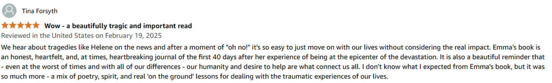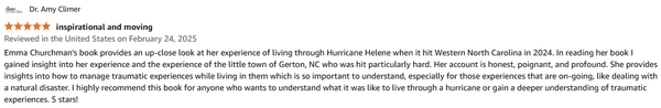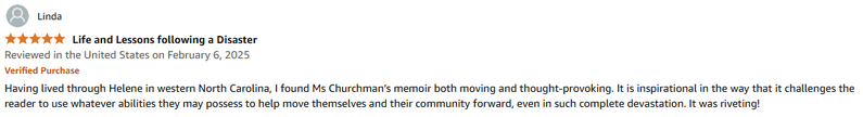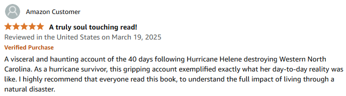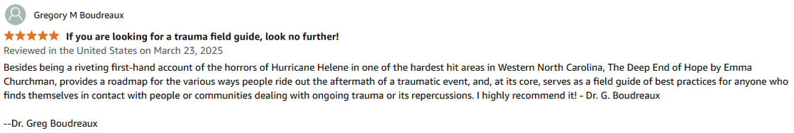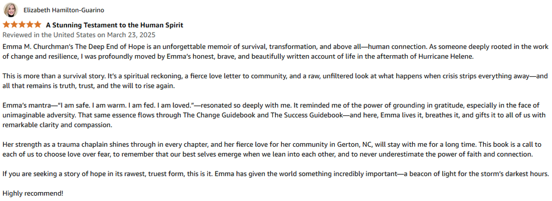 Her bestselling book, The Deep End of Hope in the Wake of Hurricane Helene (GracePoint, 2025), takes readers on an unforgettable journey of spiritual resilience during one of nature’s most recent catastrophic events.